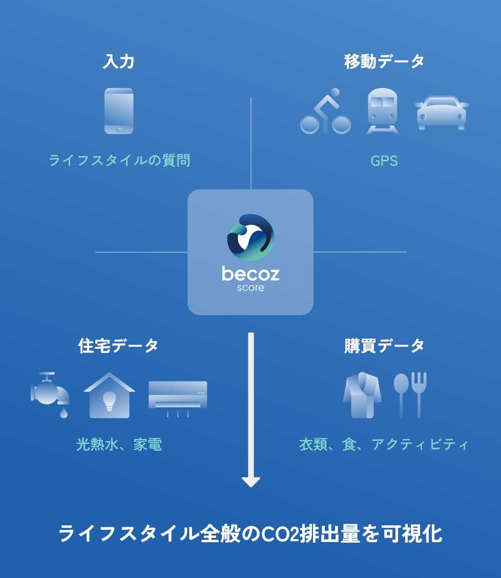 多数のデータ活用事業を手がける当社は、画像、音声、テキストなど異なる様式のデータを統合的に処理するマルチモーダルデータ活用に強みを持ち、GPSの移動データや航空写真に基づく森林データなどからCO2排出量を算出するアルゴリズム構築の実績(※1)があります。「becoz」事業においても、クレジットカードの決済データだけではなく、レシート、ECサイト購入履歴などの購入店舗や商品まで特定でき、グリーンバリューチェーンプラットフォーム(※2)が提供する「排出源単位データベース」をもとにCO2排出量を可視化するデータ連携の仕組みの構築しております。